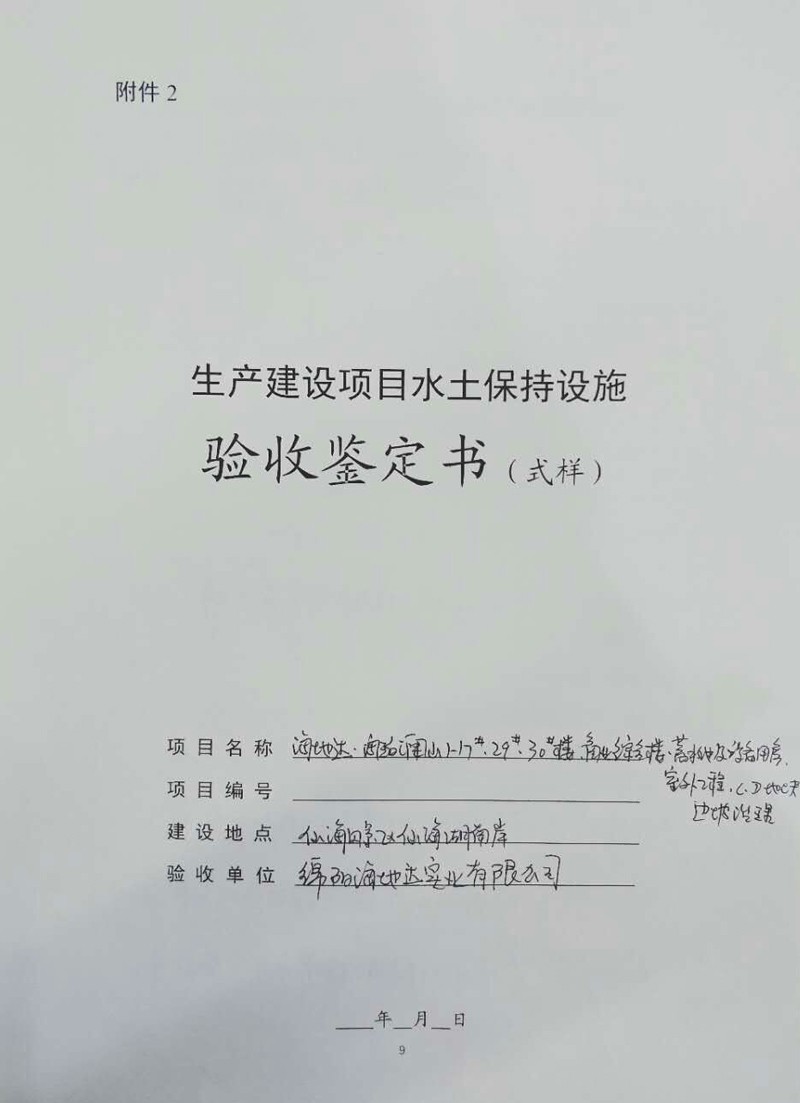 同時,為進(jìn)一步作好海地達(dá)·海珀瀾山(一期)項目水土保持工作,驗收組建議:一是對項目區(qū)存在的裸露地表進(jìn)行及時防護(hù);二是完善植物防護(hù)措施并加強維護(hù);三是制定管護(hù)制度,落實管護(hù)責(zé)任,保證各項水土保持設(shè)施持續(xù)發(fā)揮效益。